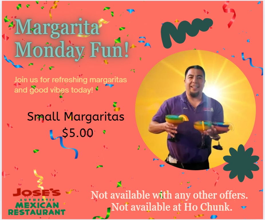 "Margarita Monday" at Jose's is the perfect way to kick off the week with a refreshing twist. Every Monday, Jose's offers small margaritas for just $5.00, allowing you to enjoy a classic cocktail without breaking the bank. It's a great opportunity to gather friends, unwind, and savor the flavors of tequila, lime, and a hint of sweetness that margaritas are famous for. Whether you're a fan of the traditional lime margarita or prefer a fruity variation, Jose's has something to satisfy your taste buds. So why not make Margarita Monday a weekly tradition and start the week off on a high note?