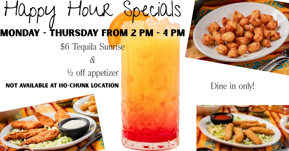 HAPPY HOUR SPEICAL! Monday - Thursday from 2 pm - 4 pm - $6.00 - Tequila Sunrise - 1/2 off one appetizer (Not Ho Chunk Location)