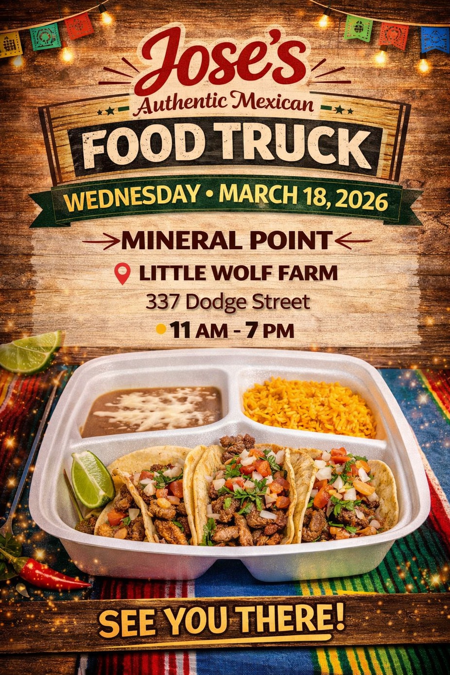That’s why Jose’s Authentic Mexican Food Truck is coming to save the day on Wednesday, March 18, 2026 at Little Wolf Farm! Skip the dishes, ignore the fridge, and come grab something way more exciting than whatever you were planning to make at home.