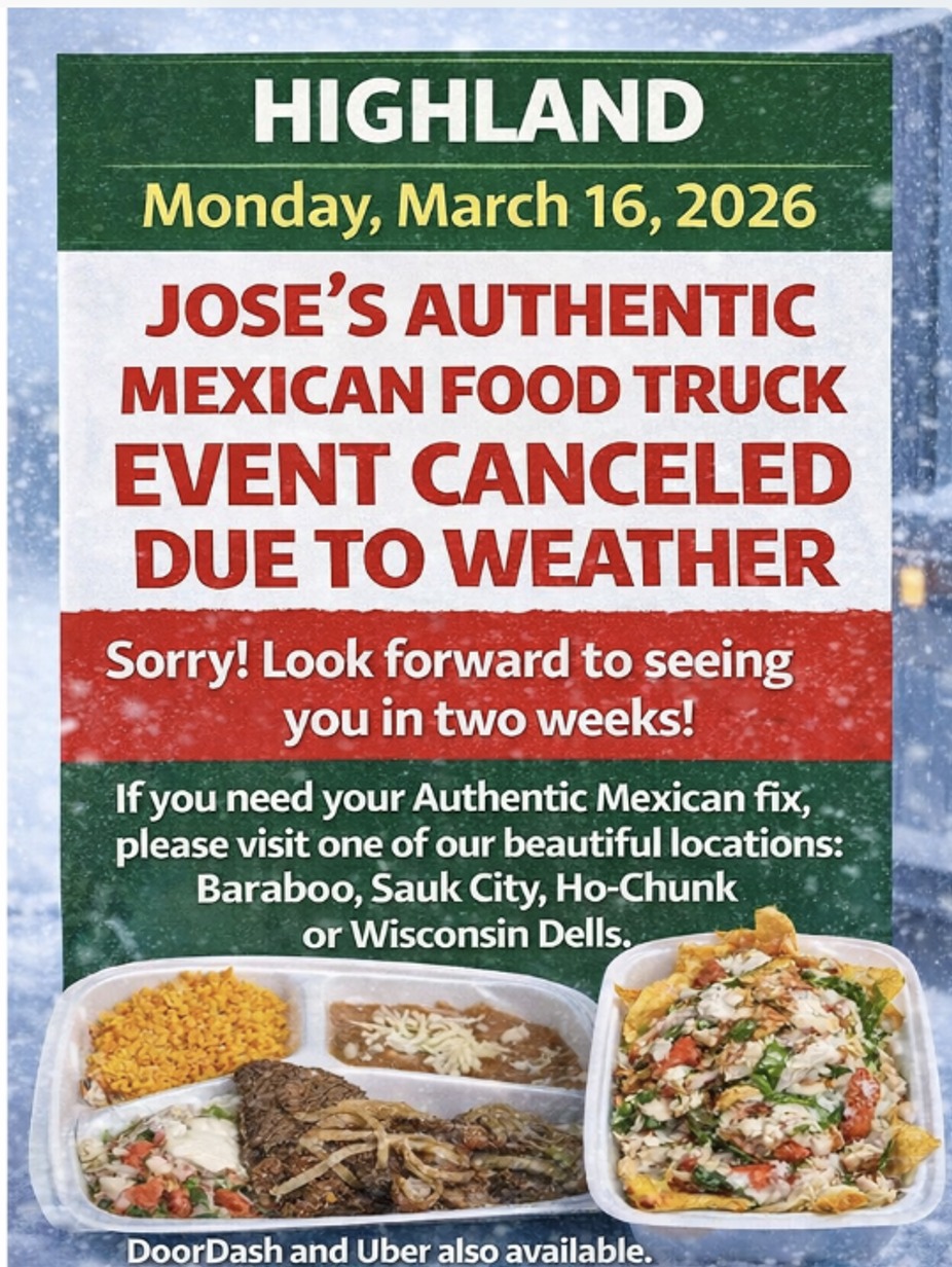 We're sorry to announce that Jose's Authentic Mexican Food Truck won't be rolling into Highland on March 16th due to the unpredictable weather. But don't worry! We’ll be back in two weeks, ready to serve up your favorite dishes. In the meantime, satisfy your cravings at one of our beautiful restaurants in Baraboo, Ho-Chunk Casino, Sauk City, or Wisconsin Dells. Can’t make it out? No problem! Our mouth-watering meals are just a click away on Door Dash and Uber Eats. Thank you for your understanding and continued support. We can't wait to serve you soon!