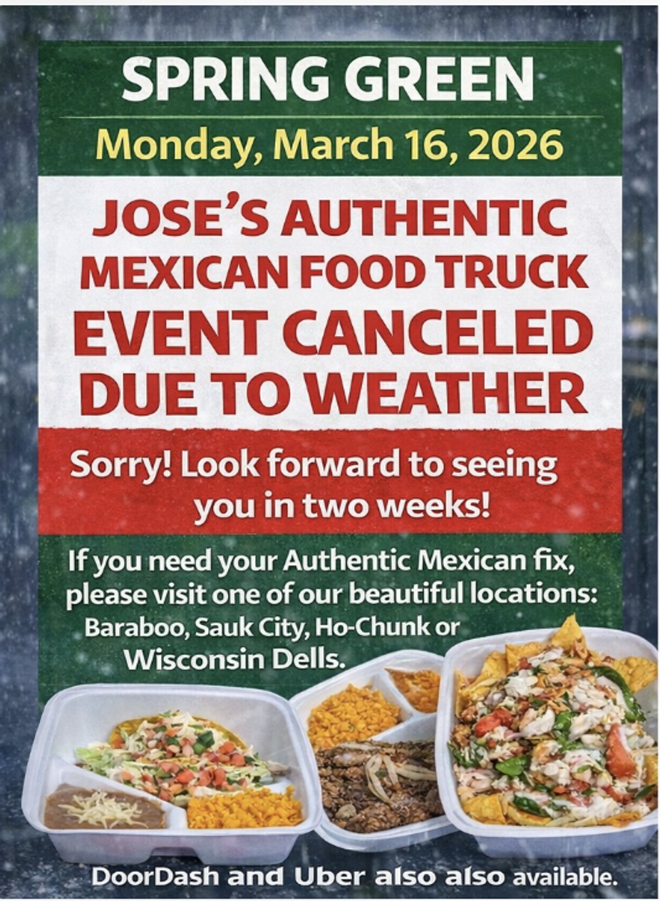 We're sorry to announce that Jose's Authentic Mexican Food Truck won't be rolling into Spring Green on March 16th due to the unpredictable weather. But don't worry! We’ll be back in two weeks, ready to serve up your favorite dishes. In the meantime, satisfy your cravings at one of our beautiful restaurants in Baraboo, Ho-Chunk Casino, Sauk City, or Wisconsin Dells. Can’t make it out? No problem! Our mouth-watering meals are just a click away on Door Dash and Uber Eats. Thank you for your understanding and continued support. We can't wait to serve you soon!